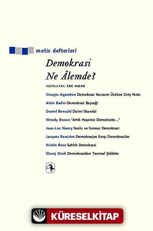 Dizinin ilk kitabı Demokrasi Ne Âlemde? La Fabrique yayınevinin (Paris) yaptığı çok güzel bir derleme. Kitapta yayınevi editörlerinin sordukları şu sorunun izi sürülüyor: "Günümüzde 'demokrasi' kelimesi çok geniş bir mutabakat sağlıyor. Şüphe yok ki bu kelimenin anlamı veya anlamları konusunda zaman zaman hiç de hoş olmayan bir üslupla tartışıyoruz. Ama bizlerin içinde yaşadığı 'dünya'da demokrasi kelimesine olumlu bir değer atfedilmesi genel olarak kabul görüyor. Sorumuzun çıkış noktası da bu işte: Sizin için 'demokrasi' kelimesini kullanmanın bir anlamı var mı? Yoksa neden? Varsa kelimenin hangi yorumuna göre?"