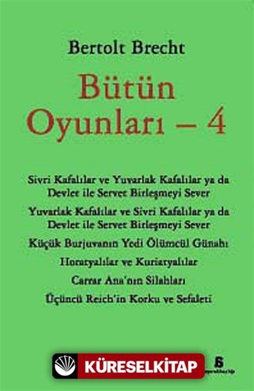 10 cilt halinde yayınlanacak olan Bertolt Brecht'in Bütün Oyunları 4. cildinde yayınlacak oyunları Sivri Kafalılar ve Yuvarlak Kafalılar ya da Devlet ile Servet Birleşmeyi Sever Yuvarlak Kafalılar ve Sivri Kafalılar ya da Devlet ile Servet Birleşmeyi Sever Küçük Burjuvanın Yedi Ölümcül Günahı Horatyalılar ve Kuriatyalılar Carrar Ana'nın Silahları Üçüncü Reich'in Korku ve Sefaleti