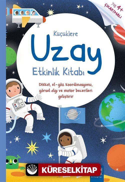 Küçüklere Uzay Etkinlik Kitabı bir sürü bulmaca farkları bulma boyama ve noktaları birleştirme etkinliği içeriyor. Küçük astronotlar Güneş Sistemi'ne gezegen çıkartmaları yapıştıracak uzaya fırlatılan bir roket çizecek şirin bir uzaylının doğum günü partisinin resmini boyayacak çıkartmalarla kendi resmini yaratacak ve daha pek çok keyifli etkinlik sayesinde zamanın nasıl geçtiğini anlamayacak.